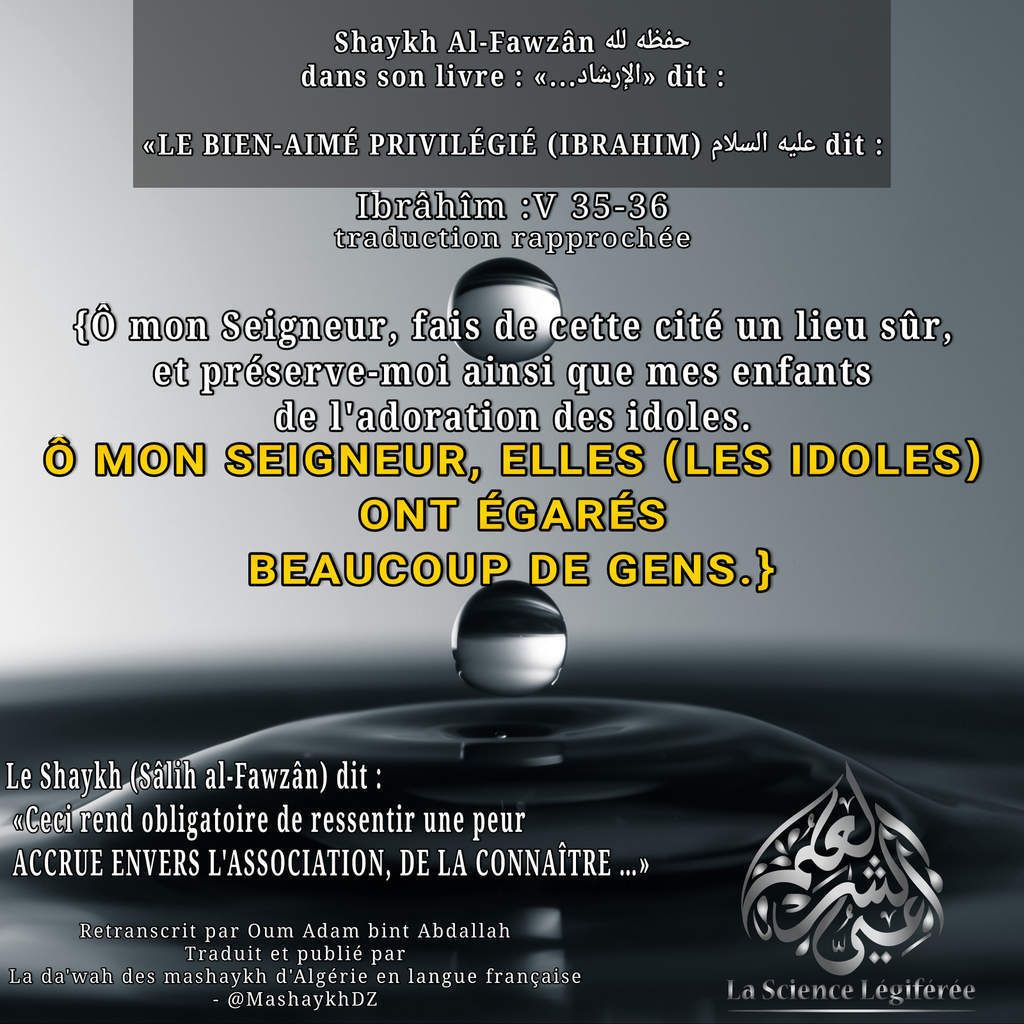 {Ô mon Seigneur, fais de cette cité un lieu sûr, et préserve-moi ainsi que mes enfants de l’adoration des idoles. Ô mon Seigneur, elles (les idoles) ont égarés beaucoup de gens.} (Ibrâhîm : 35-36)»